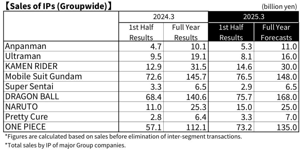 - Anpanman earned 5.3 billion yen in the first half, up 300 million from Bandai’s initial projection.