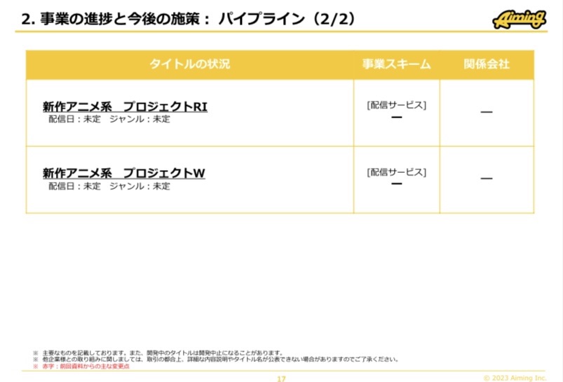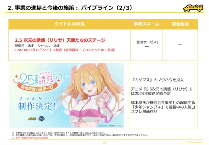 In Aiming’s second quarter report, another anime project was listed alongside Project G: “Project W.” We now know that this game is Wind Breaker: Rebel Heroes. When we go back to Aiming’s third quarter report of 2023, we can see a “Project RI” that was later explicitly confirmed by Aiming to be 2.5 Dimensional Seduction: Angels on Stage!