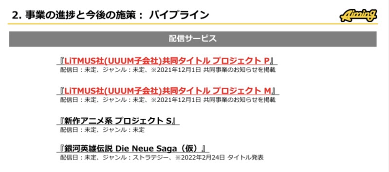 Gacha game developer Aiming has gradually shifted from their original IPs to anime IPs over the last few years. They shut down the console versions of their original game, Caravan Stories, and since 2022, they’ve released The Eminence in Shadow: Master of Garden (2022), DanMachi: Battle Chronicle (2023), 2.5 Dimensional Seduction: Angels on Stage! (2024), and Legend of the Galactic Heroes: Die Neue Saga (2024), and have announced Wind Breaker: Rebel Heroes for 2025. But their most recent financial presentation revealed one more anime game in development with the codename “Project G.” Here, I’ll try to figure out what “Project G” is.