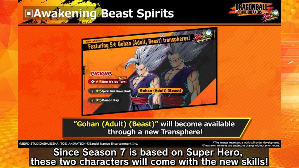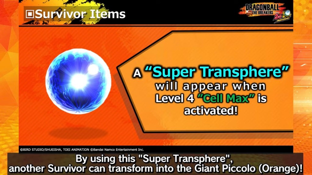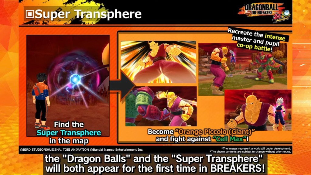 Two new Transpheres will be added in Season 7: Gohan Beast and Orange Piccolo. And for the first time in the game, both the Dragon Balls and the Super Transphere will be available on the stage for players to fight against Cell Max with both Gohan Beast and Orange Piccolo.