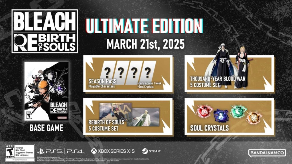 - Ultimate Edition ($99.99) – Includes the Deluxe Edition content, an extra Soul Crystal set, Thousand-Year Blood War costumes for Byakuya and Rangiku, and a 5 game-exclusive costumes