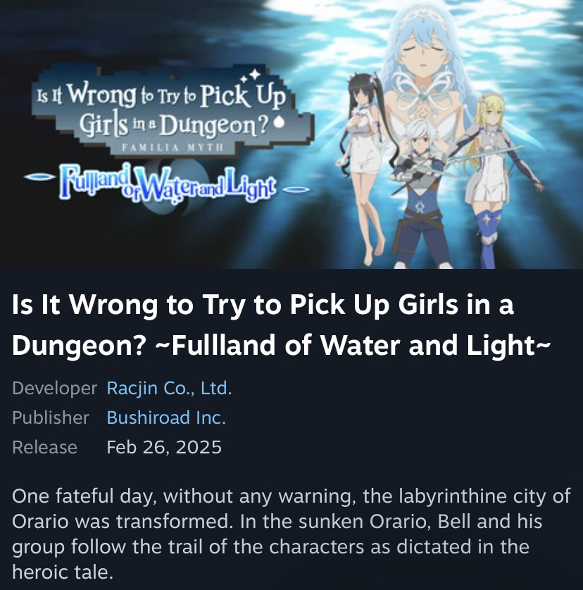 The Steam page for Is It Wrong to Pick Up Girls in a Dungeon? Familia Myth: Fullland of Water and Light has been opened, and it revealed that anime game mainstay Racjin is the developer.