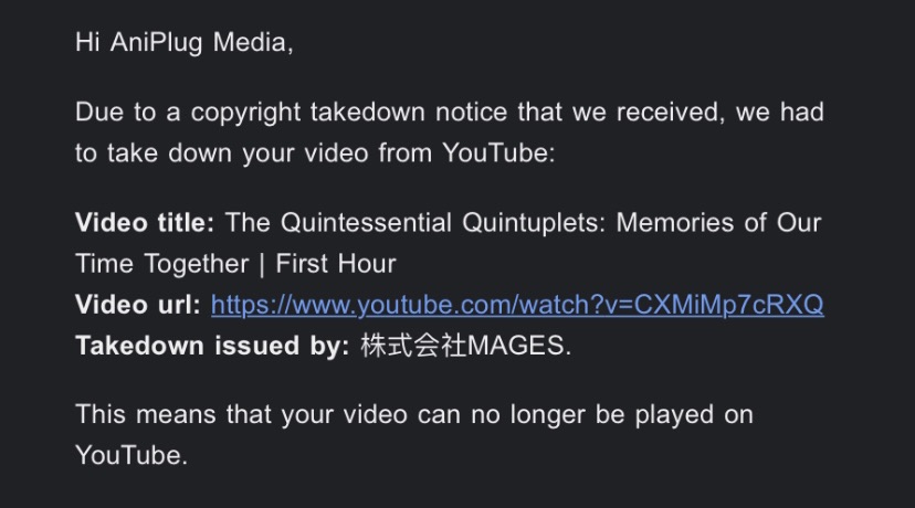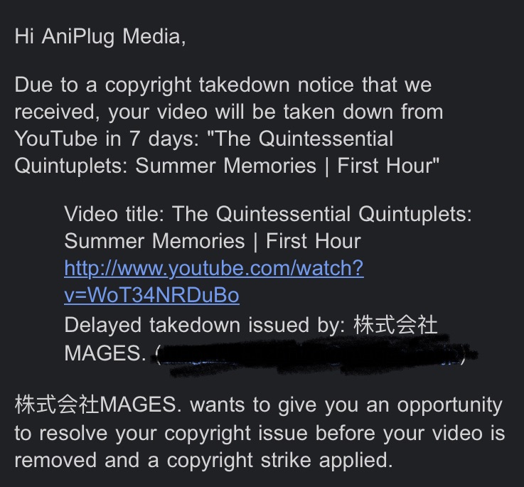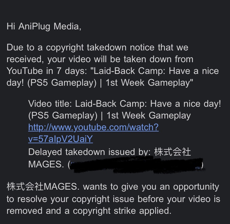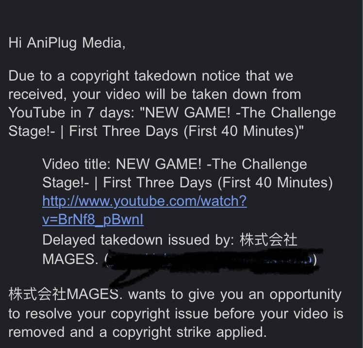 MAGES.’s stance on people uploading footage of their adventure games/visual novels to social media has been the same for years. When I reached out to them in 2023 to peacefully resolve a copyright strike, they told me that due to the nature of these games (many have branching paths and multiple endings) and since they can’t control how many people see that footage, they don’t want any of it up at all and will send copyright takedowns for any footage they find—immediate takedown for newer games and scheduled (one-week notice) takedowns for games more than a year old. MAGES. producer Chiyomaru Shikura himself has even filed a takedown for a company-approved stream of Anonymous;Code by HOLOSTARS V-Tuber Minase Rio.
