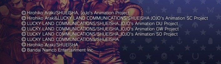 The first five lines directly correlate to the anime. The 6th line, which lists only Lucky Land Communications and Shueisha, is for the yet-to-be-animated parts, Steel Ball Run and Jojolion. The seventh line, which lists Hirohiko Araki himself instead of Lucky Land Communications, is for Baoh, and we can conclude that because this specific line isn’t in Eyes of Heaven and neither is Baoh. The eighth line is for the game itself, which Bandai obviously owns the rights to. To compare, let’s look at Dengeki Bunko: Fighting Climax: