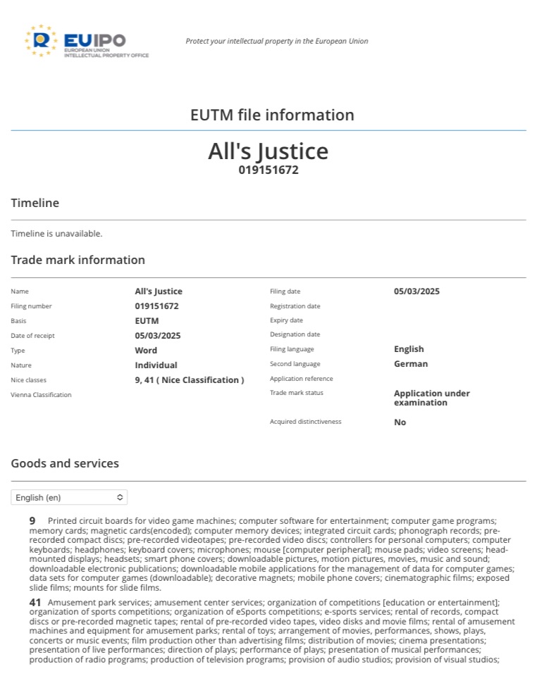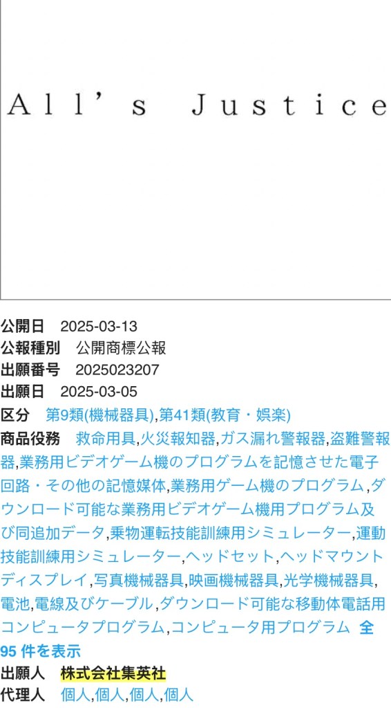 Shueisha applied to register “All’s Justice” as a trademark in Europe and Japan on March 5, and in the United States on March 7.