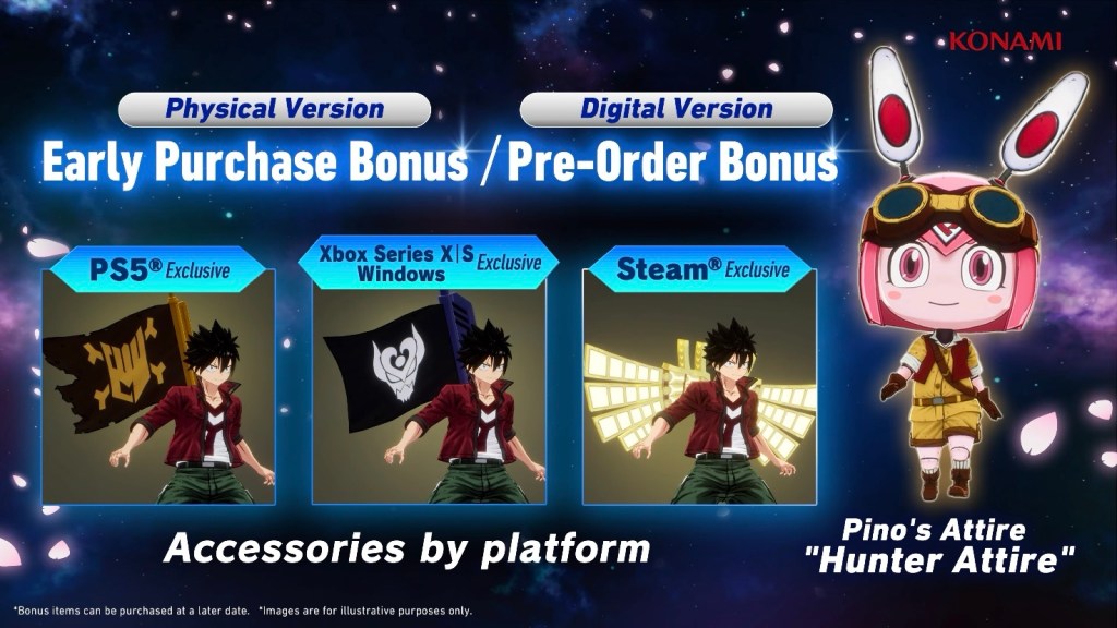 Digital pre-orders and the physical Day One Edition include the “Hunter Attire” costume for Pino and, depending on the platform, Elsie’s Pirate Flag (PS5), Demon King’s Flag (Xbox), or Dragon Wings (Steam) accessory.