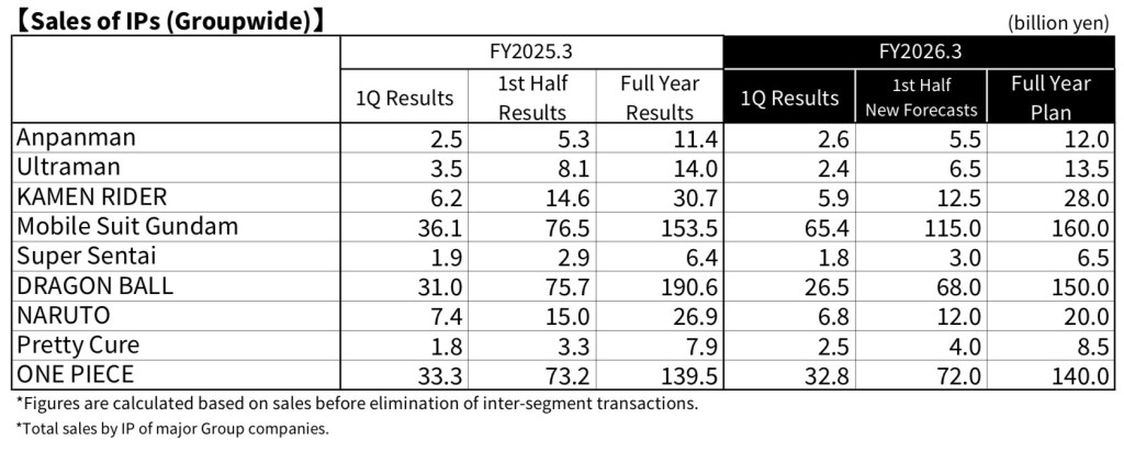 Bandai Namco has released their Q1 FY2026 financial reports, revealing in their Financial Highlights that not only was Mobile Suit Gundam the top IP, but it also brought in more revenue than Dragon Ball and One Piece combined.