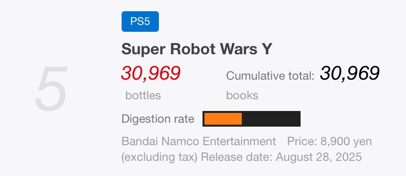 Famitsu released its Top 30 game sales ranking for the week of August 25, 2025 to August 31, 2025, revealing that Super Robot Wars Y sold over 90,000 physical copies in its first three days in Japan. Both the Switch and PS5 versions were in the Top 10, at No. 2 and No. 5, and both versions sold through, at most, 60% of its initial shipments.