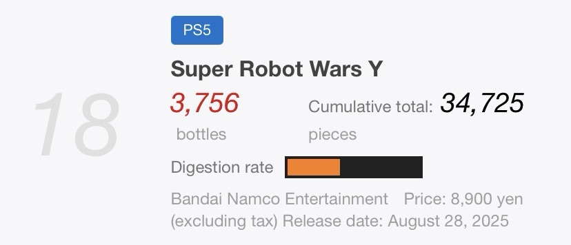 Famitsu released its Top 30 game sales ranking for the week of September 1, 2025 to September 7, 2025, revealing that Super Robot Wars Y sold an additional 13,000 physical copies in Japan, pushing the total past 100,000. The Switch version remained in the Famitsu Top 10 at No. 7, while PS5 dropped to No. 18. The Switch version has now sold through most of its initial shipment.