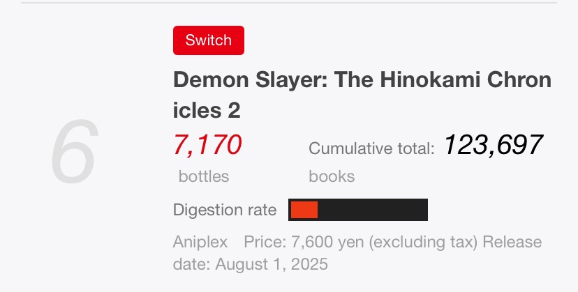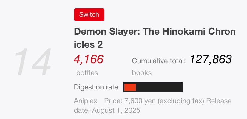 Demon Slayer: The Hinokami Chronicles 2 has sold over 150,000 physical copies in Japan, according to Famitsu’s Top 30 game sales ranking. The Switch version sold 7,041 physical copies (ranked No. 5) in the week of September 8 to September 14, 7,170 (ranked No. 6) in the week of September 15 to September 21, and 4,166 copies (ranked No. 14) in the week of September 22 to 28.