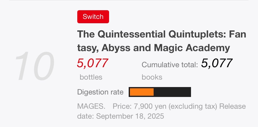 Famitsu’s Top 30 ranking for the week of September 15 to September 21, 2025 has revealed that The Quintessential Princesses: Illusions, Abyss, and the Magical Academy has sold over 5,000 physical copies on Nintendo Switch, selling through at least 60% of its initial shipment and ranking No. 10 in its release week. The PlayStation 5 version didn’t chart.