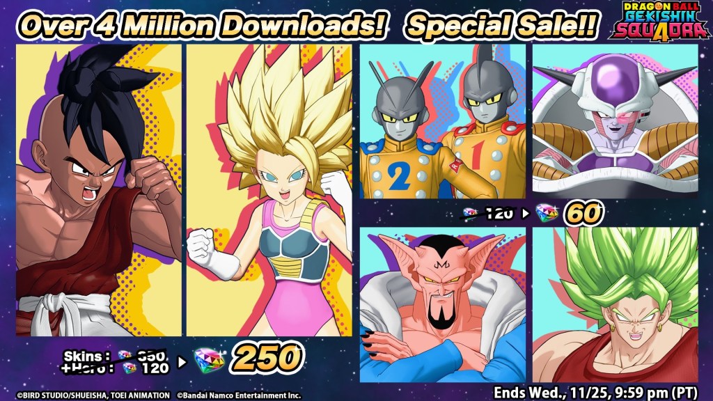 Bandai Namco announced that Dragon Ball: Gekishin Squadra has surpassed 4 million downloads. To celebrate this milestone, Bandai is holding the following campaigns: