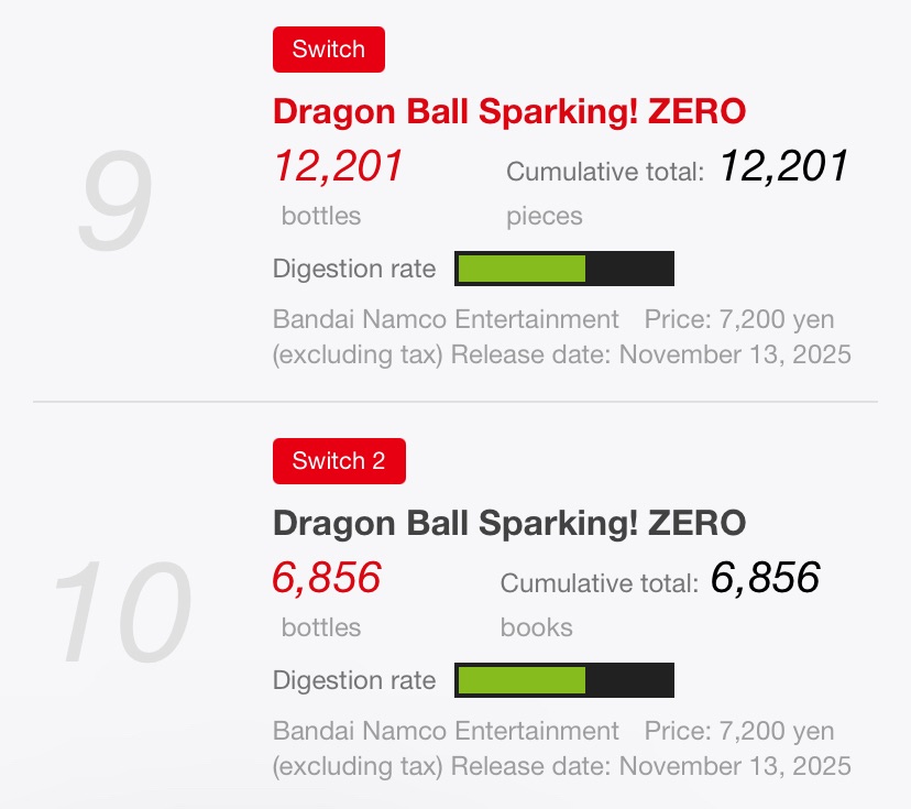 Famitsu released its Top 30 game sales ranking for the week of November 10, 2025 to November 16, 2025, revealing that the Nintendo Switch and Nintendo Switch 2 versions of Dragon Ball: Sparking! ZERO sold a combined 19,057 physical copies in Japan.