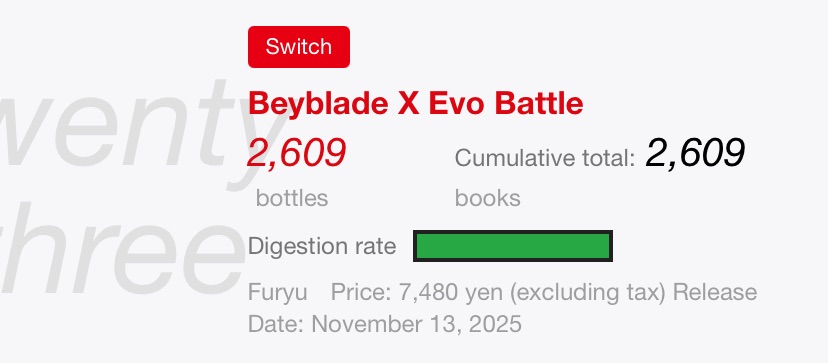 Beyblade X: EVOBATTLE is off to an abysmal start, selling 2,609 physical copies—less than 20% of the initial shipment—and ranking No. 23.