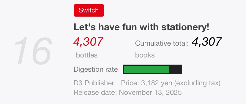 Let’s Play Together with Stationery (お文具といっしょ ユルっとポチっと遊びましょ), based on the Together with Stationery (お文具といっしょ) web manga, sold 4,307 physical copies—at least 20% of the initial shipment—ranked at No. 16.
