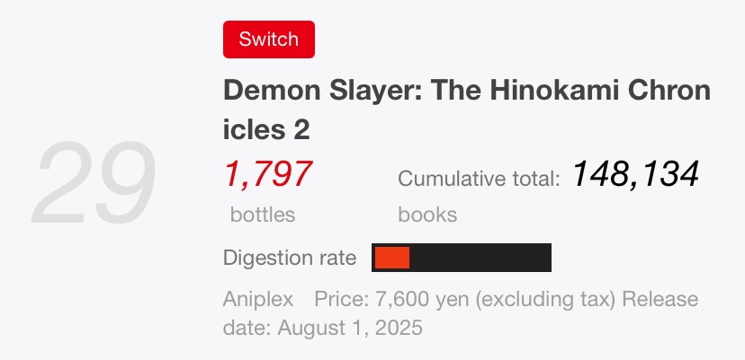 The Nintendo Switch version of Demon Slayer: The Hinokami Chronicles 2 sold an additional 1,797 physical copies, bringing the total to 148,134 on Switch and 172,508 overall. The game has stayed in Famitsu’s Top 30 since its release on August 1.